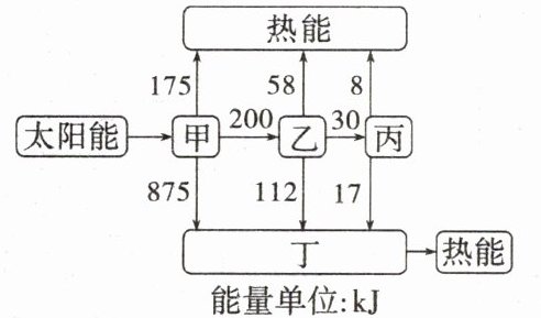 C@@解析:能量流动是从甲(生产者)固定太阳能开始的,流入该生态系统的总能量为$175 + 200 + 875 = 1250(kJ)$,A正确;从乙到丙的能量传递效率为$30÷200×100\% = 15\%$,B正确;将乙和丙的粪便作为有机肥还田,可以提高能量的利用率,但不能提高能量的传递效率,C错误;食物链的营养关系是长期自然选择的结果,一般不可逆转,因此能量流动是单向的,D正确。