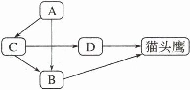 C@@解析:分析题图可知,图中有3条食物链,即A→B→猫头鹰、A→C→B→猫头鹰、A→C→D→猫头鹰。题中所求为猫头鹰体重每增加1kg,至少消耗的A的质量,已知高营养级的能量求最少所需低营养级能量时,选最短食物链(A→B→猫头鹰),能量传递效率按20%计算,则至少消耗A的质量为$1÷20\%÷20\% = 25(kg)$,C正确。