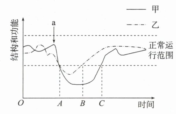 D@@解析:从题图中可以看出,甲、乙两个生态系统在受到同等强度的干扰后,甲生态系统保持自身结构和功能相对稳定的能力弱,结构和功能波动大,可推知其抵抗力稳定性低,A正确;若乙生态系统干扰提前,由于乙生态系统恢复自身原状的周期不变,所以B点也会提前,B正确;若甲生态系统所受的干扰强度增大,则甲生态系统恢复自身原状所需要的时间更长,所以C点右移,C正确;抵抗力稳定性是指生态系统抵抗外界干扰并使自身的结构与功能保持原状的能力,所以抵抗力稳定性越高,受到相同程度的外界干扰时偏离正常范围的程度越小,故题图中偏离正常运行范围的程度可以体现抵抗力稳定性的大小,D错误。