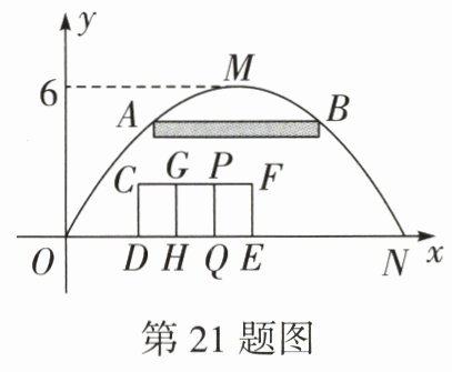 21. (中考新考法·综合与实践——课题实践活动)(12 分)毛竹工艺品远销全球,安徽广德就是中国十大毛竹之乡之一. 某度假村利用毛竹为原材料做成一个抛物线型的凯旋门,按照如图所示的方式建立平面直角坐标系,已知其跨度 ON 为 16 米,且最高点距地面 6 米.