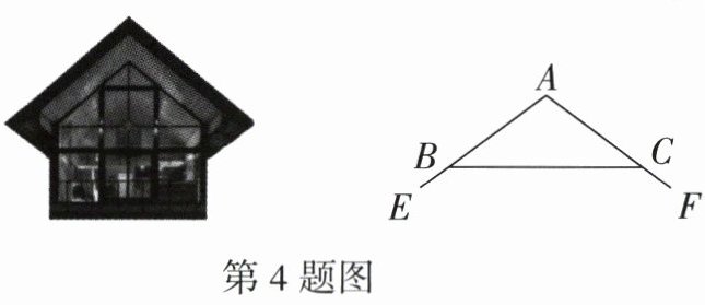 4. 如图,已知北方某户居民屋顶对称,坡度为$\frac{3}{4}$,其房屋$BC$宽$4$m,两侧需要加装屋檐$BE$和$CF$,且$BE = 50$cm,则单侧铺瓦的长度$AE$为 ( )