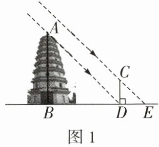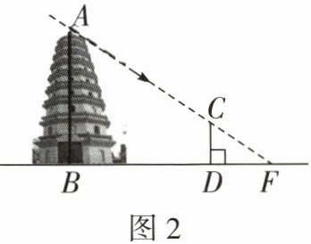 |说明|白天,某一时刻龙象塔AB的塔顶A的影子恰好落在小树CD的底部,同一时刻,小树CD的影子为线段DE,测得小树的高度CD = 1.3 m,DE = 1.95 m.|晚上,龙象塔AB的塔顶A处的探照灯光照射小树,得到影子DF,测得小树CD = 1.3 m,DF = 2 m.|