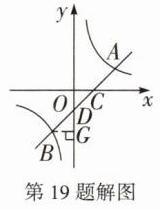 19. ( 教材 P49 第 6 题改编) ( 10 分) 如图,直线 $y = k_{1}x - 2$ 与双曲线 $y = \frac{k_{2}}{x}$ 交于 $A,B$ 两点,直线 $AB$ 与 x 轴交于点 $C$,与 y 轴交于点 $D$, $\angle OCD = 45^{\circ}, BD = 2\sqrt{2}$.