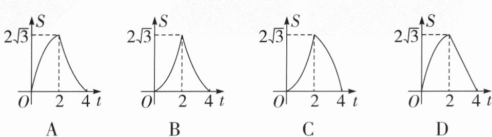 10. 如图,在边长为 4 的等边三角形 ABC 中,动点 P 以每秒 1 个单位长度的速度从点 A 开始沿着 $A→B→C$ 的方向向终点 C 运动,动点 Q 以每秒 2 个单位长度的速度从点 B 开始沿着 $B→C→A$ 的方向向终点 A 运动,当其中一个动点运动到终点时,另一个动点也停止运动.如果两个动点同时开始运动,设运动时间为 t 秒, $\triangle BPQ$ 的面积为 S,则 S 关于 t 的函数图象可能是 ( )