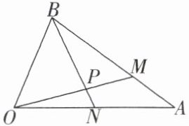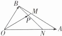 【例3】如图所示,在$\triangle OAB$中,$\overrightarrow{OA}=\boldsymbol{a}$,$\overrightarrow{OB}=\boldsymbol{b}$,点$M$是$AB$上靠近$B$的一个三等分点,点$N$是$OA$上靠近$A$的一个四等分点.若$OM$与$BN$相交于点$P$,求$\overrightarrow{OP}$.