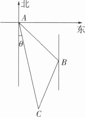 解:设用t h,甲船追上乙船,且在C处相遇,则在$\triangle ABC$中,$AC = 28t$,$BC = 20t$,$AB = 9$,$\angle ABC=180^{\circ}-15^{\circ}-45^{\circ}=120^{\circ}$,由余弦定理得$(28t)^{2}=81+(20t)^{2}-2\times9\times20t\times\left(-\frac{1}{2}\right)$,即$128t^{2}-60t - 27 = 0$,解得$t=\frac{3}{4}$或$t = -\frac{9}{32}$(舍去),$\therefore AC = 21$ n mile,$BC = 15$ n mile.根据正弦定理,得$\sin\angle BAC=\frac{BC\cdot\sin\angle ABC}{AC}=\frac{5\sqrt{3}}{14}$,则$\cos\angle BAC=\sqrt{1 - \frac{75}{14^{2}}}=\frac{11}{14}$又$\angle ABC = 120^{\circ}$,$\angle BAC$为锐角,$\therefore\theta = 45^{\circ}-\angle BAC$,$\sin\theta=\sin(45^{\circ}-\angle BAC)$$=\sin45^{\circ}\cos\angle BAC-\cos45^{\circ}\sin\angle BAC=\frac{11\sqrt{2}-5\sqrt{6}}{28}$.