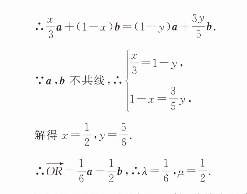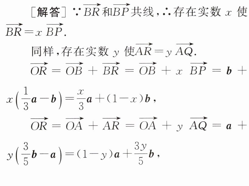例7 在$\triangle AOB$的边$OA$,$OB$上分别有一点$P$,$Q$.已知$OP:PA = 1:2$,$OQ:QB = 3:2$,连接$AQ$,$BP$,设它们交于$R$点.若$\overrightarrow{OA}=\boldsymbol{a}$,$\overrightarrow{OB}=\boldsymbol{b}$,设$\overrightarrow{OR}=\lambda\boldsymbol{a}+\mu\boldsymbol{b}$,试求出$\lambda$和$\mu$的值.