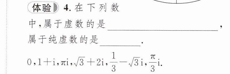 体验4 $1 + i,\pi i,\sqrt{3}+2i,\frac{1}{3}-\sqrt{3}i,\frac{\pi}{3}i$ $\pi i,\frac{\pi}{3}i$
