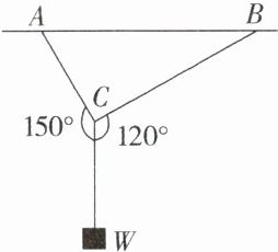 【例3】如图,用两根绳子把重10 N的物体W吊在水平杆子AB上,∠ACW = 150°,∠BCW = 120°,求A和B处所受力的大小(绳子的质量忽略不计).