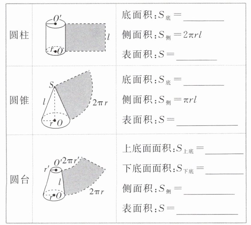 知识点1 $\pi r^{2}$ $2\pi rl + 2\pi r^{2}$ $\pi r^{2}$ $\pi rl+\pi r^{2}$ $\pi r'^{2}$ $\pi r^{2}$ $\pi l(r + r')$ $\pi(r'^{2}+r^{2}+r'l + rl)$