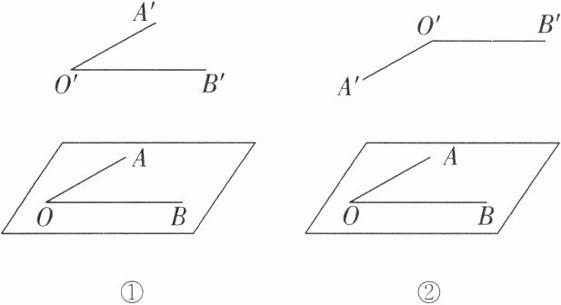 (2)符号语言:如图①②所示,在∠AOB与∠A'O'B'中,OA//O'A',OB//O'B',则∠AOB = ∠A'O'B'或∠AOB + ∠A'O'B' = 180°.