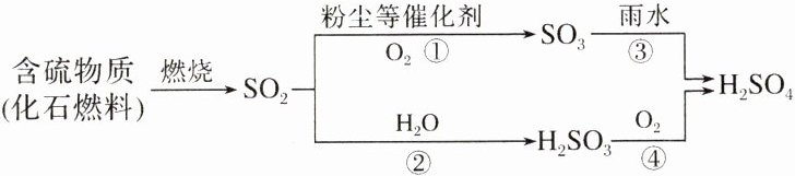 $2SO_{2}+O_{2}\underset{粉尘等催化剂}{\overset{}{⇌}}2SO_{3}$@@$SO_{2}+H_{2}O⇌H_{2}SO_{3}$@@$SO_{3}+H_{2}O=H_{2}SO_{4}$@@$2H_{2}SO_{3}+O_{2}=2H_{2}SO_{4}$