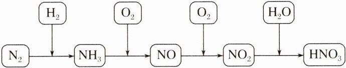 $N_{2}+3H_{2}\underset{催化剂}{\overset{高温、高压}{⇌}}2NH_{3}$@@$4NH_{3}+5O_{2}\underset{\triangle}{\overset{催化剂}{=}}4NO + 6H_{2}O$@@$2NO + O_{2}=2NO_{2}$@@$3NO_{2}+H_{2}O=2HNO_{3}+NO$