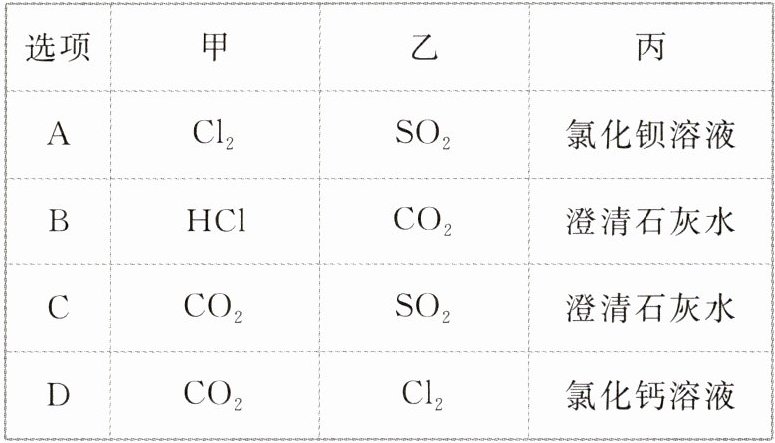解析 在溶液中Cl₂可将SO₂氧化为$SO_{4}^{2 - }$,进而与BaCl₂反应生成硫酸钡沉淀,A符合题意;若HCl或CO₂过量,则HCl和CO₂混合气体通入澄清石灰水中没有沉淀,B不符合题意;CO₂和SO₂组成的混合气体通入澄清石灰水中,若CO₂、SO₂过量,则没有沉淀,C不符合题意;CO₂和Cl₂通入CaCl₂溶液中无沉淀产生,D不符合题意。