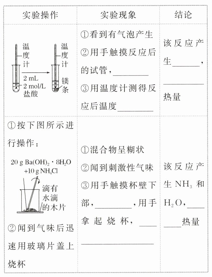 温热@@升高@@气体@@放出@@冰凉@@木片与烧杯粘在一起@@吸收