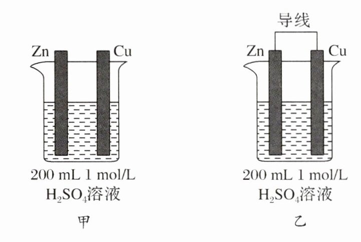 3. 如下图所示,甲、乙中Zn棒和Cu棒的直径、长度都相同,H₂SO₄溶液温度也相同。甲和乙中哪个锌棒上发生反应的速率更大?