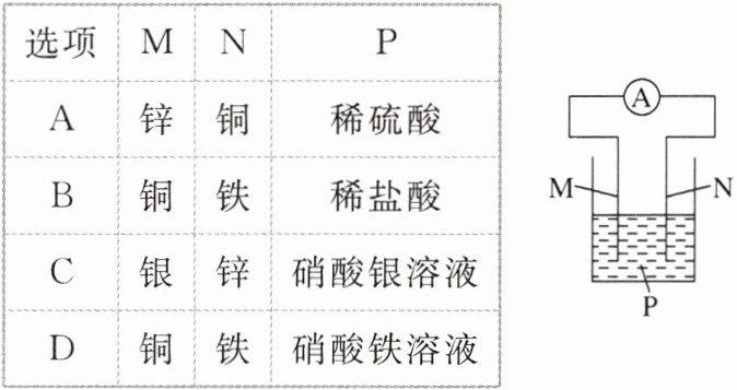 C [经分析可知该装置是原电池,其中M棒作正极,有金属单质析出,N棒作负极,失电子溶解。A项,锌、铜、稀硫酸构成原电池,则锌是负极,M棒变细,不符合题意;B项,铁、铜、稀盐酸构成原电池,M棒上无金属单质析出,不符合题意;C项,锌、银、硝酸银溶液构成原电池,则锌是负极,M棒上有银析出,符合题意;D项,铁离子得到电子转化为亚铁离子,不能析出金属,不符合题意。]