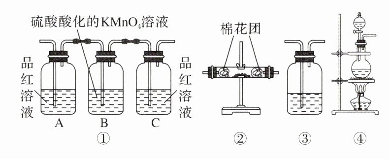 【训练1】 浓硫酸和木炭在加热时发生反应的化学方程式是$2H_{2}SO_{4}(浓)+C\xlongequal{\triangle}CO_{2}\uparrow + 2H_{2}O + 2SO_{2}\uparrow$。用下图所示各装置设计一个实验,验证浓硫酸与木炭在加热条件下反应产生的各种产物。