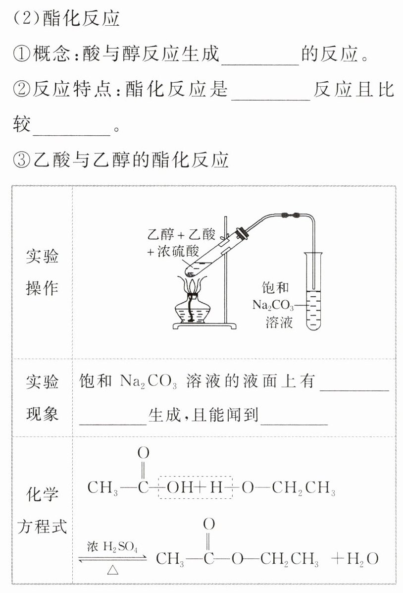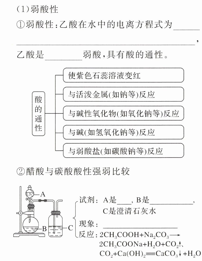 3. (1)① $CH_{3}COOH\rightleftharpoons CH_{3}COO^{-}+H^{+}$ ,一元酸;② 醋酸与碳酸钠溶液、澄清石灰水反应会变浑浊。(2)① 酯和水;② 可逆,缓慢;③ 无色透明油状液体,有香味。