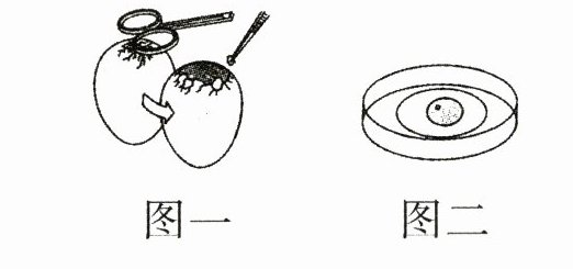 (4)用剪刀将开口处的内壳膜剪破,将卵壳内的轻轻倒入倒入培养皿中(如图二所示)仔细仔细观察,可以发现卵黄在系带的牵引下悬浮于卵白中,卵黄的表面有一个白色的小圆点,该结构就是_______。