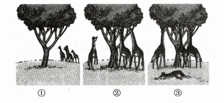(1)生物界普遍存在着变异,古代的长颈鹿存在着颈长和颈短、前肢长和前肢短的变异,这些变异是可以遗传的。因此,图①说明古代的长颈鹿个体之间颈长存在着长短的差异。