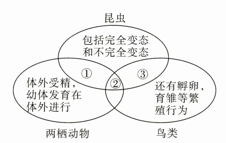 B 解析:昆虫和两栖动物的发育都是变态发育;昆虫、两栖动物和鸟类都是卵生;昆虫和鸟类都是体内受精。