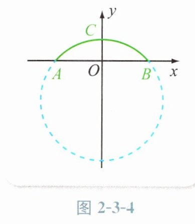 解 作出示意图如图2−3−4所示,其中AB表示跨度,O为AB中点,OC为圆拱高.以O为原点,AB所在直线为x轴建立平面直角坐标系,根据已知条件有B($\frac{a}{2}$,0),C(0,b).