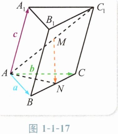 例1 如图1 - 1 - 17所示,已知斜三棱柱$ABC - A_{1}B_{1}C_{1}$中,$\overrightarrow{AB} = \boldsymbol{a}$,$\overrightarrow{AC} = \boldsymbol{b}$,$\overrightarrow{AA_{1}} = \boldsymbol{c}$,在$AC_{1}$上和$BC$上分别有一点$M$和$N$,且
