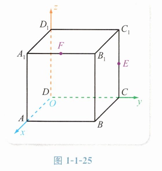 已知棱长为1的正方体$ABCD - A_{1}B_{1}C_{1}D_{1}$中,$E$是$CC_{1}$的中点,$F$是$A_{1}B_{1}$的中点.以$D$为原点,$\overrightarrow{DA}$,$\overrightarrow{DC}$,$\overrightarrow{DD_{1}}$的方向分别为$x$轴、$y$轴、$z$轴正方向,建立如图1−1−25所示的空间直角坐标系.求以下各点的坐标:$A$,$B$,$B_{1}$,$E$,$F$.