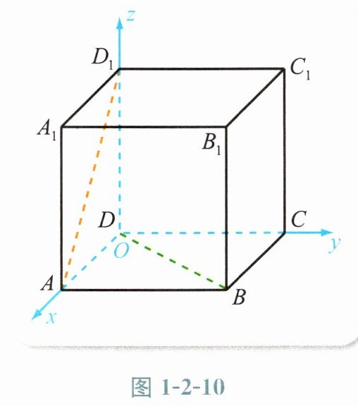 解:以D为原点,$\overrightarrow{DA}$,$\overrightarrow{DC}$,$\overrightarrow{DD_{1}}$的方向分别为x轴、y轴、z轴正方向,正方体的棱长为单位长度,建立如图1−2−10所示的空间直角坐标系.