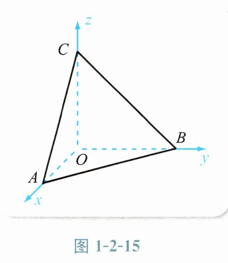 例2 如图1−2−15所示,已知空间直角坐标系中的三棱锥O - ABC中,O(0,0,0),A(a,0,0),B(0,b,0),C(0,0,c),其中abc≠0,求平面ABC的一个法向量.