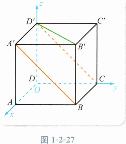 解(方法一)以D 为原点,$\overrightarrow{D A} ,\overrightarrow{D C} , \overrightarrow{D D}$的方向分别为x轴、y轴、z轴正方向,正方体的棱长为单位长度,建立如图 1-2-27 所示的空间直角坐标系。