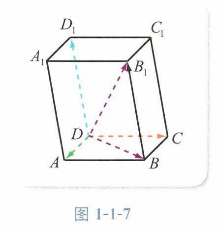 例1 如图1−1−7所示是一个平行六面体$ABCD - A_{1}B_{1}C_{1}D_{1}$,化简 $\overrightarrow{DA}+\overrightarrow{DC}+\overrightarrow{DD_{1}}$.