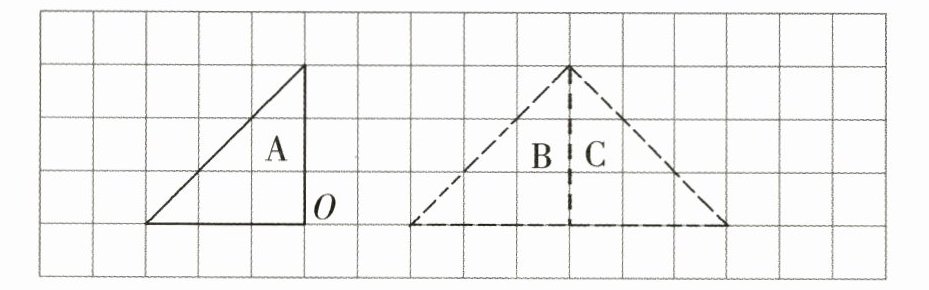 图形A向右平移5格得到图形B。@@示例:图形A先绕O点顺时针旋转90°,再向右平移5格得到图形C。@@