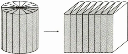 把底面半径是 $6\ cm$、高是 $10\ cm$的圆柱切割后,拼成一个近似的长方体。