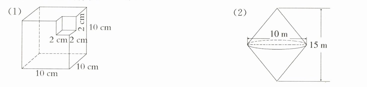 $10×10×10 - 2×2×2 = 992(cm^{3})$@@$\frac{1}{3}×3.14×(\frac{10}{2})^{2}×15 = 392.5(m^{3})$