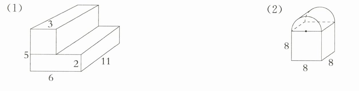 $(6×5 + 6×11 + 5×11)×2 = 302(m^{2})$ $6 - 3 = 3(m)$ $5 - 2 = 3(m)$ $3×3×2 = 18(m^{2})$ $302 - 18 = 284(m^{2})$@@$8×8×5 = 320(m^{2})$ $3.14×(8÷2)^{2}=50.24(m^{2})$ $3.14×8×8÷2 = 100.48(m^{2})$ $320 + 50.24 + 100.48 = 470.72(m^{2})$@@