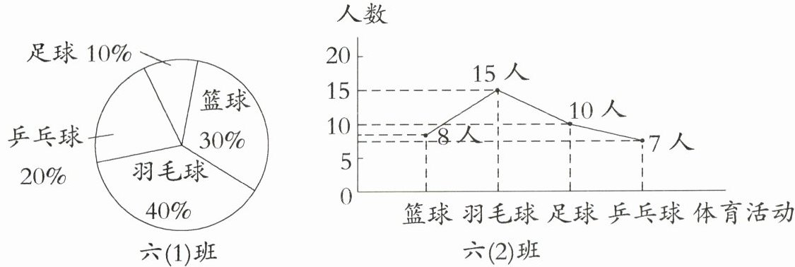 C. 喜欢羽毛球的人数六(1)班比六(2)班多 D. 喜欢篮球的人数六(2)班比六(1)班多