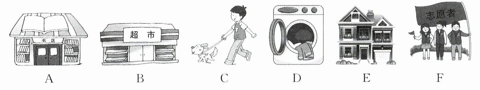 (一)听句子,选图片。你将听到五个句子,请选出与所听句子内容相符的图片,有一幅图是多余的。每个句子读两遍。