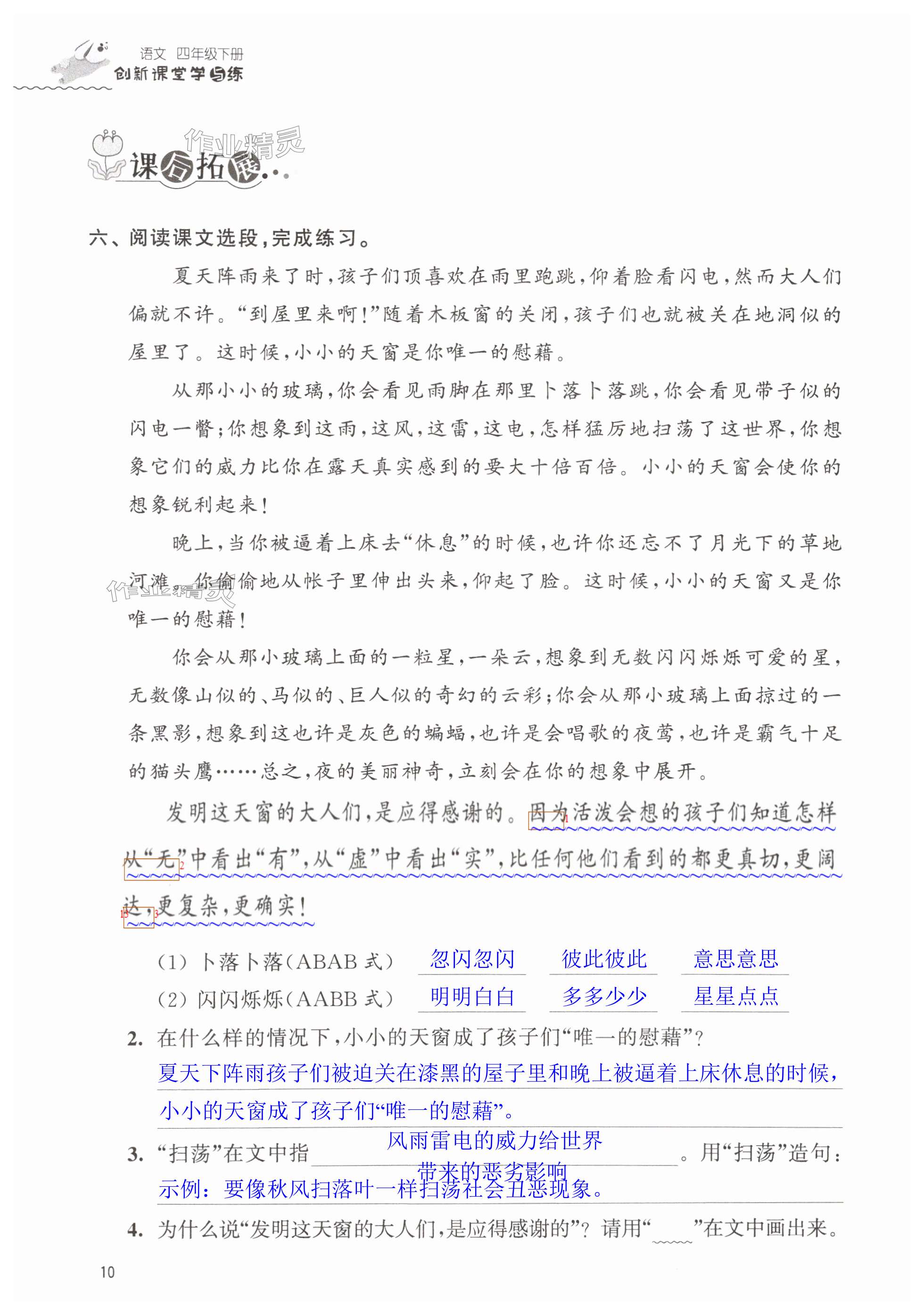 注:目前有些书本章节名称可能整理的还不是很完善,但都是按照顺序排列的,请同学们按照顺序仔细查找。练习册 2025年创新课堂学与练四年级语文下册人教版 答案主要是用来给同学们做完题方便对答案用的,请勿直接抄袭。