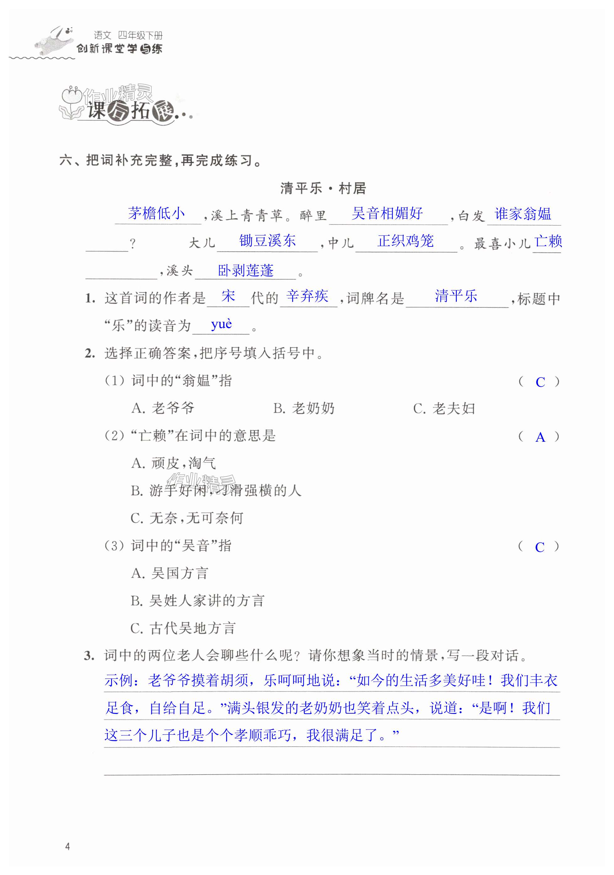 注:目前有些书本章节名称可能整理的还不是很完善,但都是按照顺序排列的,请同学们按照顺序仔细查找。练习册 2025年创新课堂学与练四年级语文下册人教版 答案主要是用来给同学们做完题方便对答案用的,请勿直接抄袭。