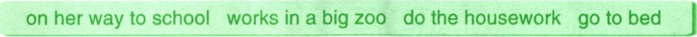 do the housework@@go to bed@@on her way to school@@works in a big zoo