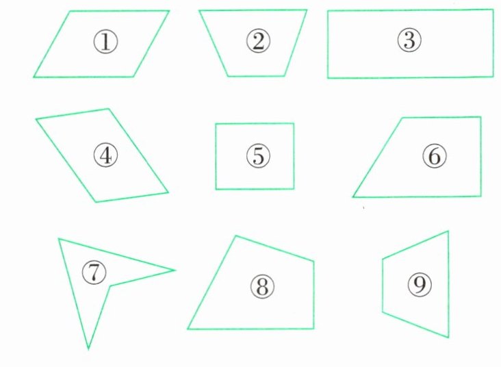 上面各图形中,是平行四边形的有________,是梯形的有________。(都填序号)