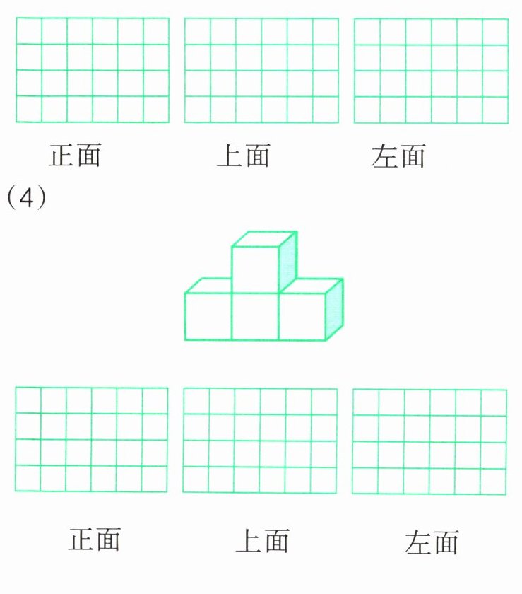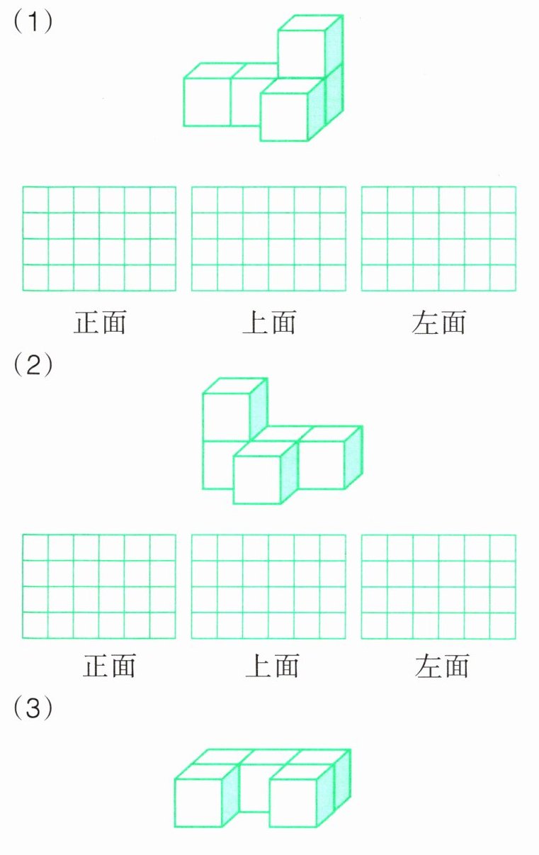 7. 画一画,下面的立体图形从正面、上面和左面看到的形状分别是什么?