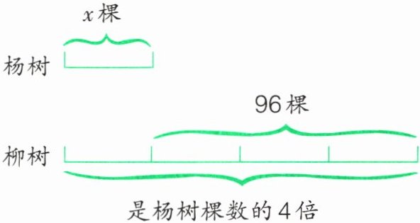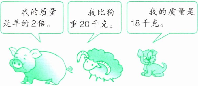$x + 96 = 4x$或$4x - x = 96$@@$C = 2(a + b)$,$S = ab$@@猪的质量 = 羊的质量×2,羊的质量 = 狗的质量 + 20