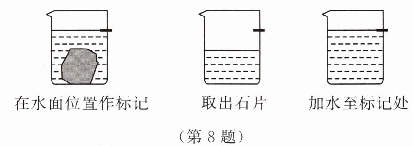 8.小江进行了如下测量:①用天平测出石片的质量m。②将石片放入烧杯中,向烧杯中加入适量水浸没石片,在水面位置作标记。取出石片,将量筒中的水缓慢倒入烧杯中,让水面升至标记处,如图所示。从量筒中倒出的水的体积V即石片的体积。③计算出石片的密度ρ。根据以上步骤测出的石片密度值会( )