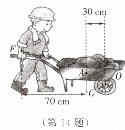14. 如图所示,用独轮车运送货物时可将它看作一根杠杆。已知独轮车车斗和车内的货物受到的总重力 $G = 900\ N$,此重力作用于 $A$ 点,车轴 $O$ 为支点。小明将车把抬起时,作用在车把上向上的力为________$N$。用这个独轮车可以________(填“省力”或“省距离”)。
