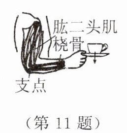 11. 如图所示的是人的肱二头肌收缩使前臂曲肘时的情况。图中已标出了支点的位置、桡骨及茶杯的受力方向。人的前臂是一个________力杠杆,这种结构给人带来的好处是________。