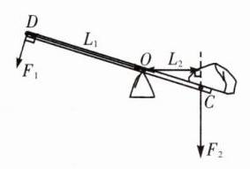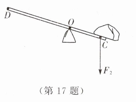 17. 如图所示,用轻质撬棒撬动地面上的石头,$O$ 是撬棒的支点,$F_2$ 是阻力。请在图中画出作用在 $D$ 点的最小动力 $F_1$、动力臂 $L_1$ 和阻力臂 $L_2$。