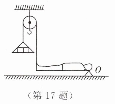 17. 某同学自制了一个可以测人体重心位置的装置,如图所示,取一块与自己等长的木板,一端固定,另一端用轻质细绳通过一个滑轮悬挂起来(摩擦不计),在绳子末端的托盘上放一些重物,使木板水平平衡。如果该同学的身高为 160 cm,质量为 40 kg,平躺到木板上后在托盘中再加上重为 140 N 的物体,木板再次水平平衡,$g$取 10 N/kg。